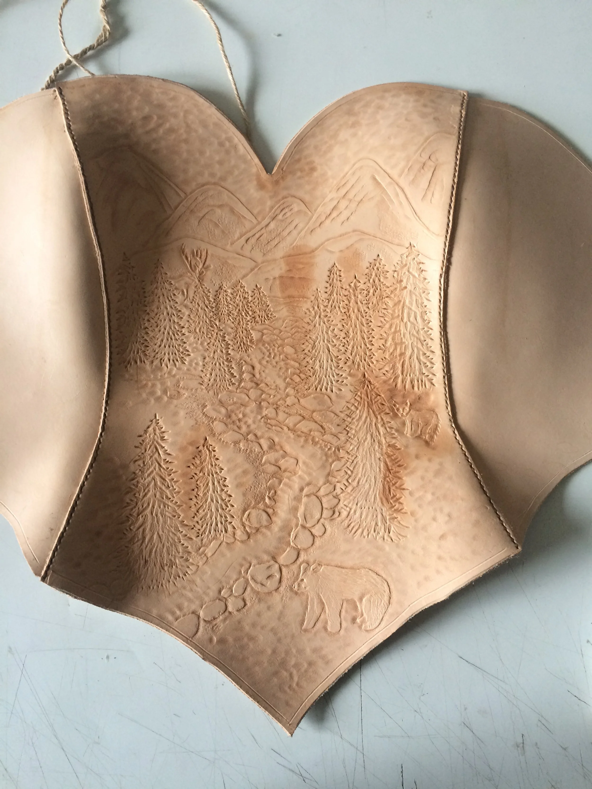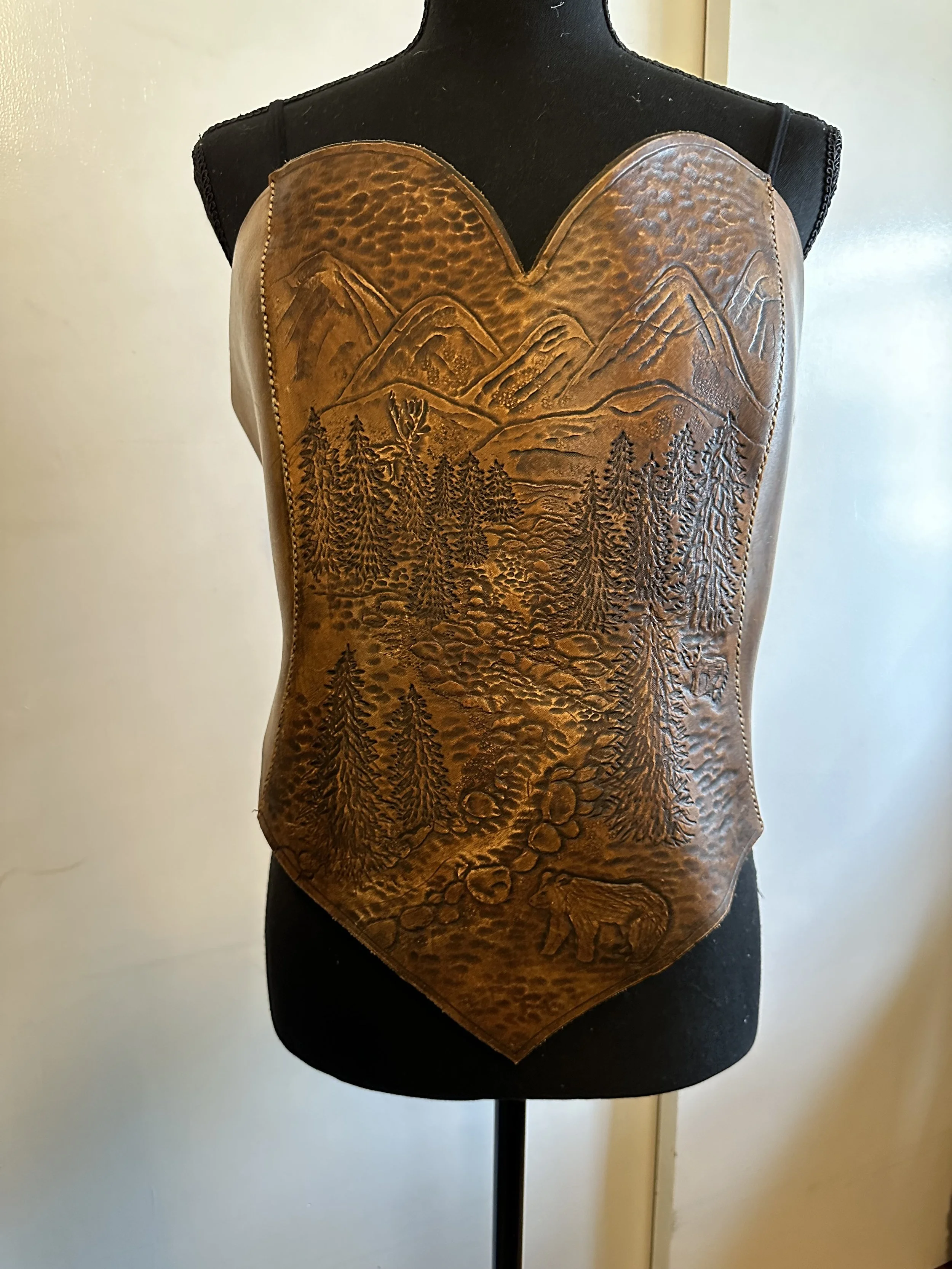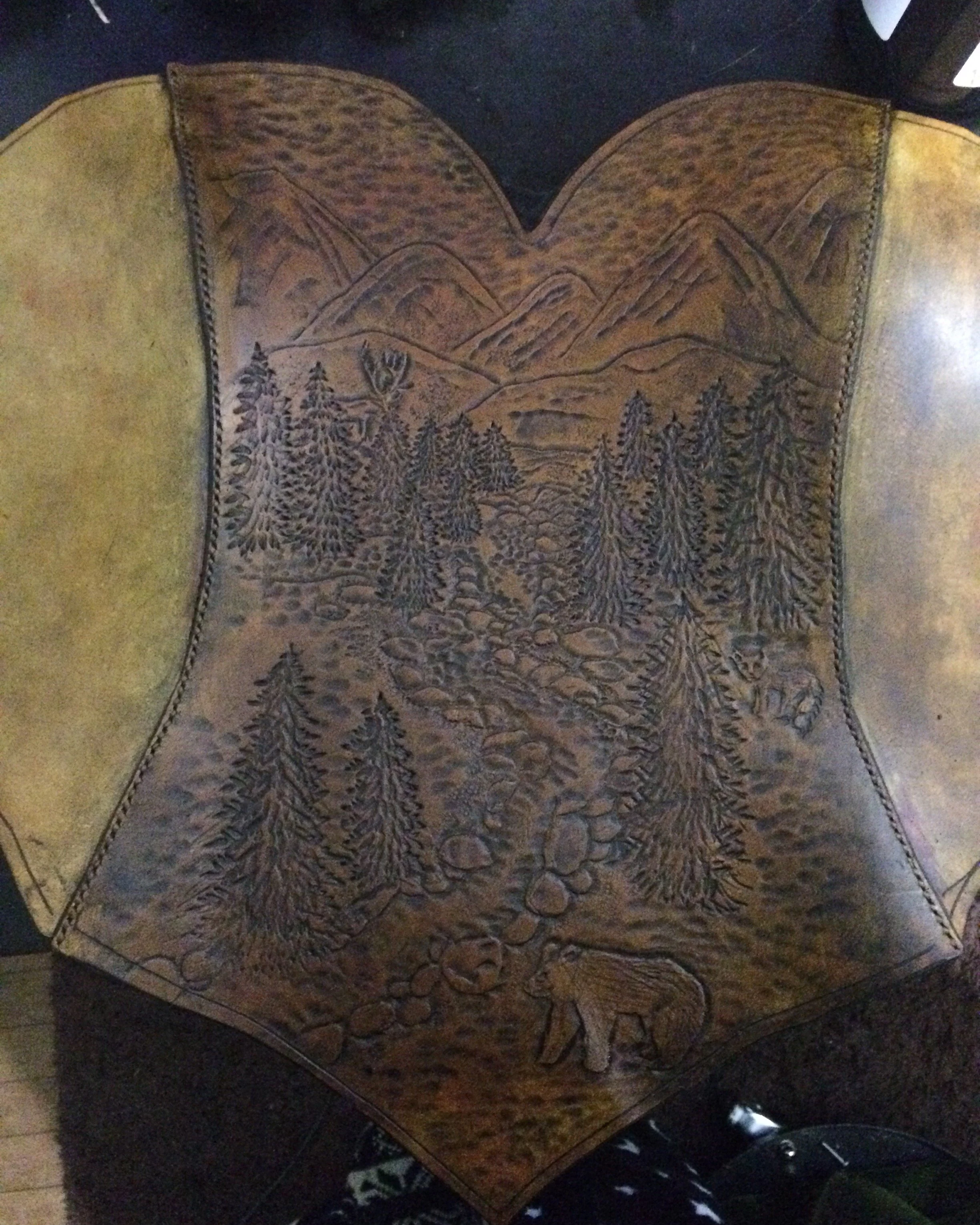 Natural Armor- this was a corset that I designed and created as a canvas for illustration, and as armor for the modern world. It is designed in such a way that it can fit a large variety of body shapes and sizes. On the front I tooled a freehand illustration of an idyllic mountain and forest scene.