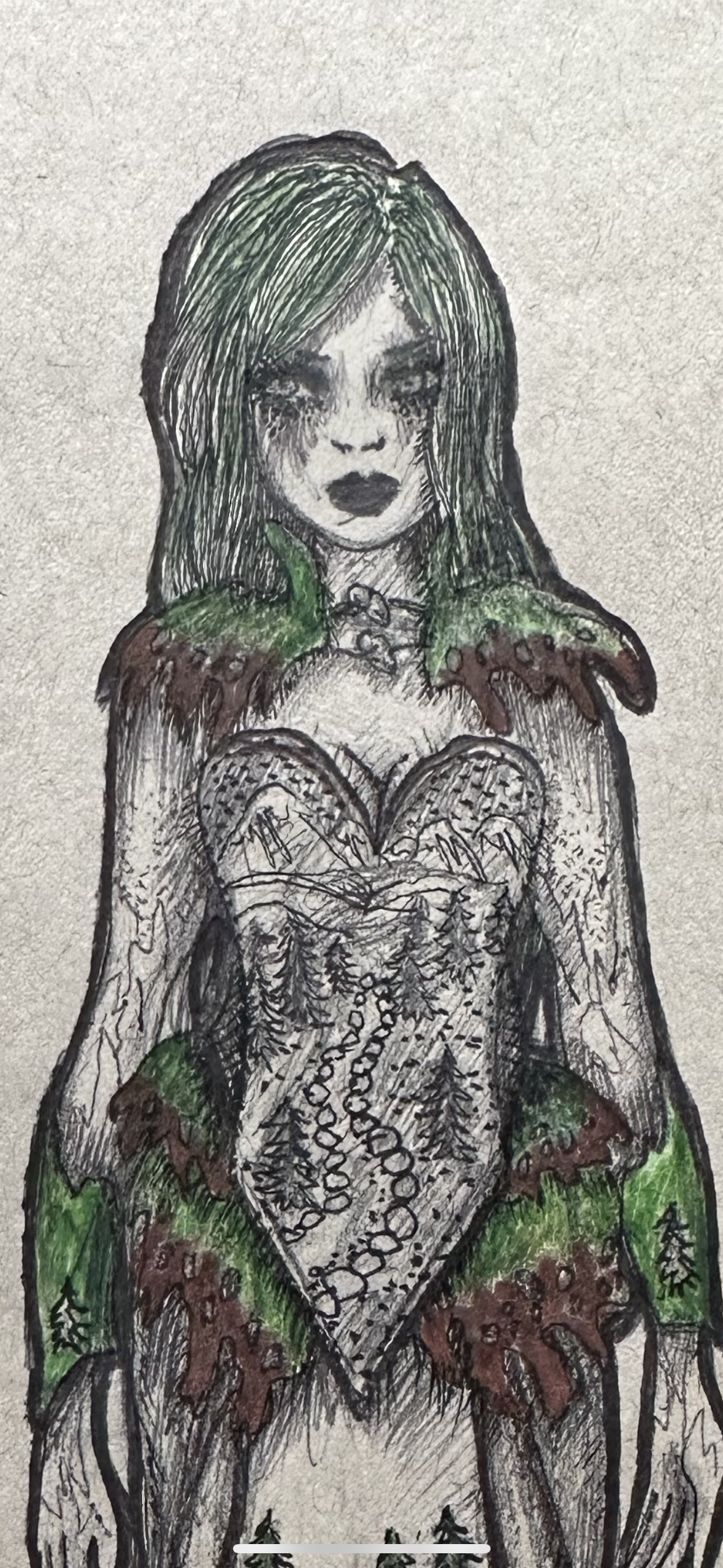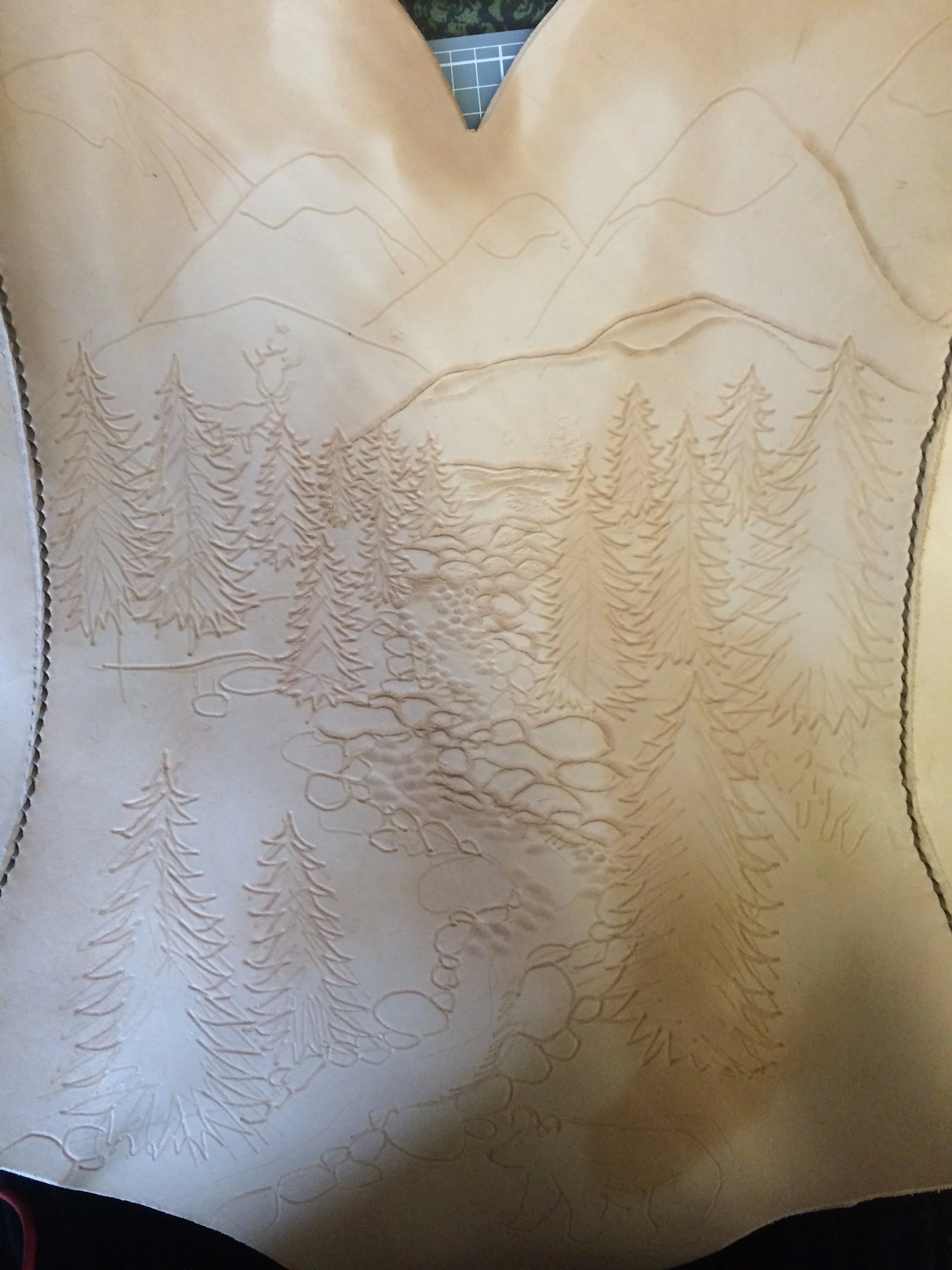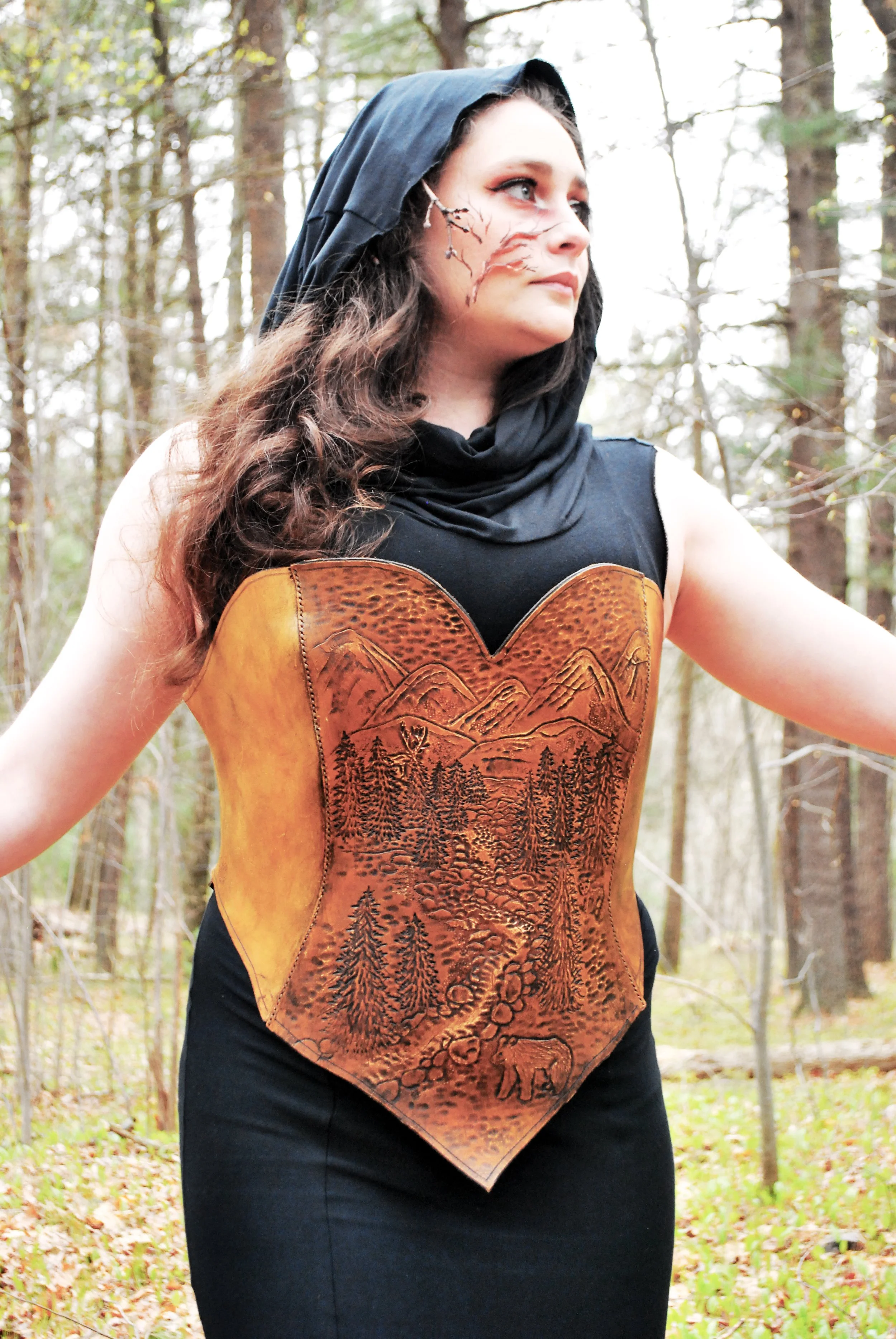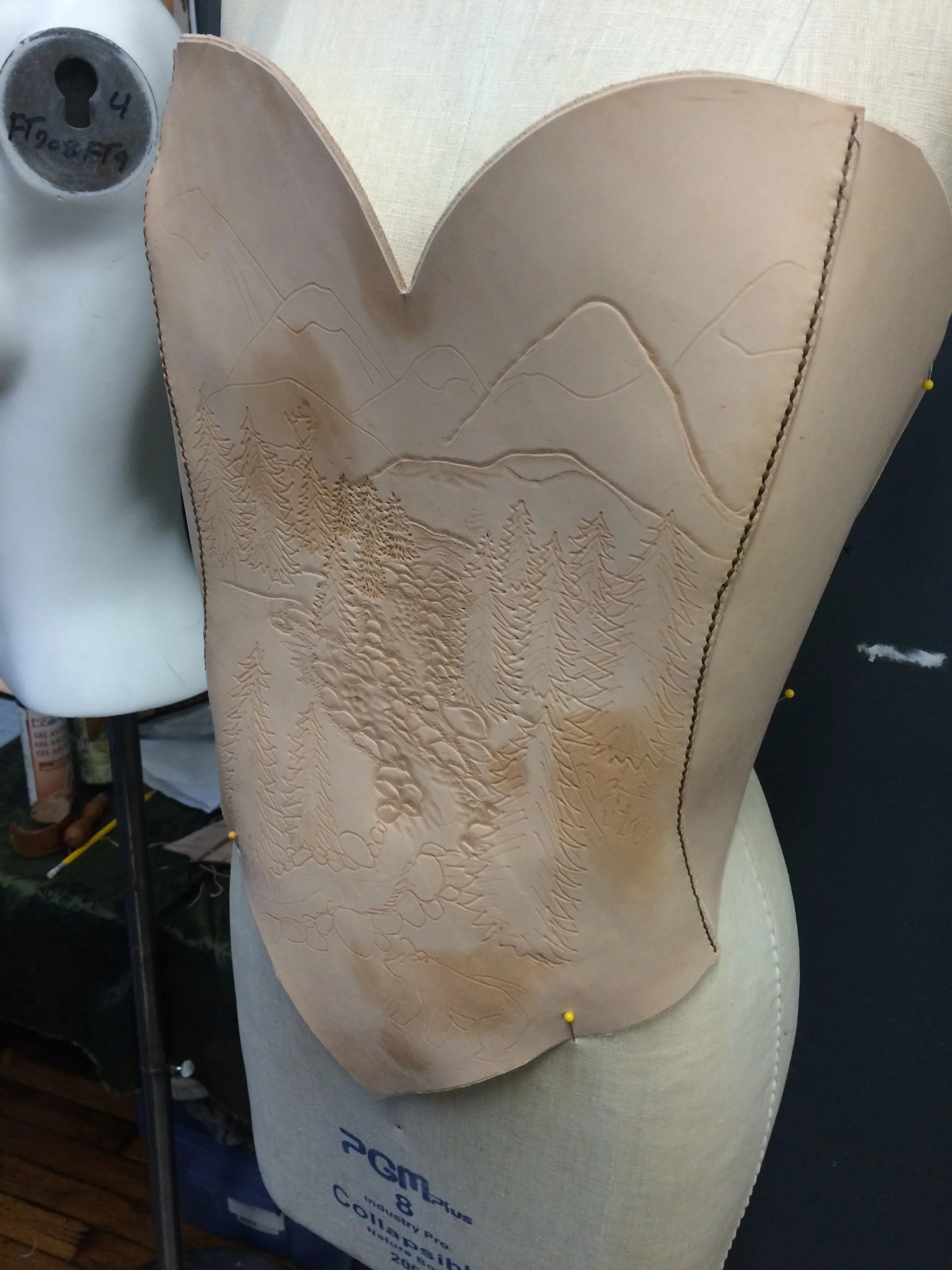 Natural Armor- this was a corset that I designed and created as a canvas for illustration, and as armor for the modern world. It is designed in such a way that it can fit a large variety of body shapes and sizes. On the front I tooled a freehand illustration of an idyllic mountain and forest scene.